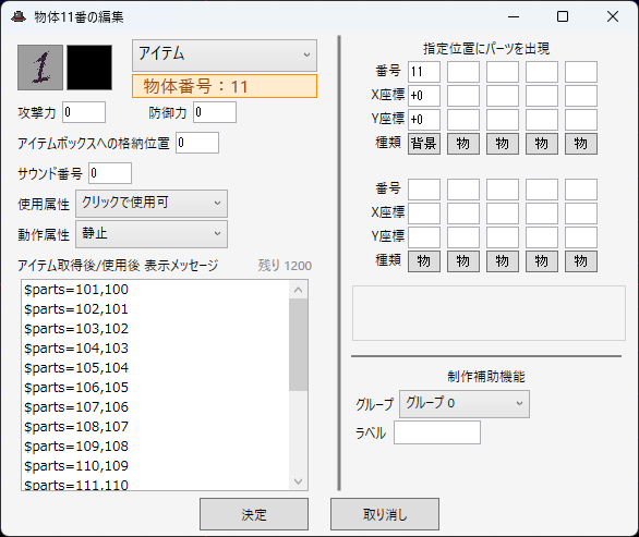背景番号10である「灰色背景に1が書いてある床」を踏んだとき、$item文で物体番号10~19がアイテムボックスに入ります。